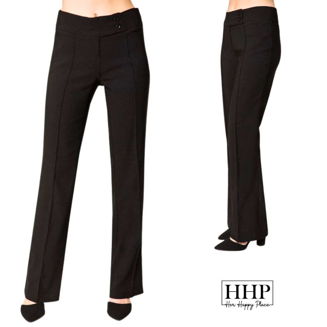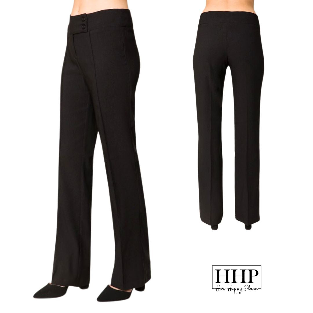 Introducing our women's plus size bootcut high waist dress pants! Designed for sizes 1xl and 2xl, these pants fit and flatter every curve with a comfortable and confident fit. The high waist design provides a streamlined silhouette, while the bootcut leg adds sophistication. These versatile pants can be dressed up or down for any occasion. Perfect for busy working women and special events, our pants offer style, comfort, and confidence. Treat yourself to a fabulous pair today and experience the joy of looking and feeling amazing!Our double button bootcut dress pants feature functional belt loops and a zip front with double buttons on the front for added style. The high waist design not only flatters your figure, but also provides a comfortable and secure fit. With front pockets for added convenience, these pants are both stylish and practical. The waist measures 37" and the front rise is 10 1/2" with an inseam of 33 1/4" for a size 1XL. For a size 2XL, the waist measures 39", the front rise is 11", and the inseam is 33 1/4". Our model is wearing a size small for reference. Upgrade your wardrobe with our double button bootcut dress pants and elevate your style game. Whether you're heading to the office or a special event, these pants will make you feel confident and put-together. Don't settle for uncomfortable and ill-fitting pants, treat yourself to a pair that will make you look and feel amazing. Order now and experience the perfect combination of style and comfort!