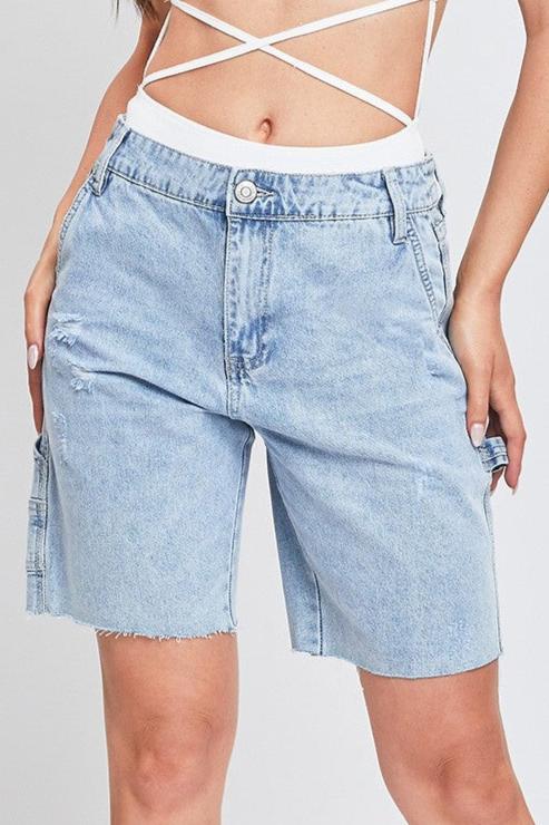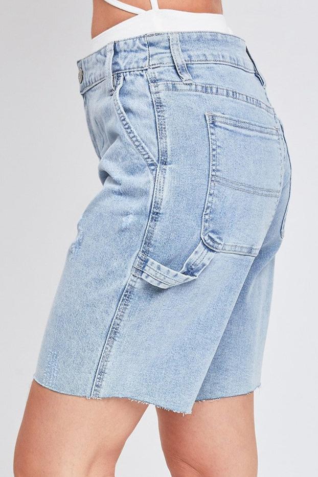 Looking for a unique twist on traditional workwear? Look no further than our Junior High Rise Denim Carpenter Shorts. These shorts feature all the utility details you love, including belt loops, slant front pockets, a hammer loop, and a utility pocket on the side. But what sets them apart is their high rise fit and fitted look, proving that practical can still be cute. Pair them with a crop top and sneakers for a casual look, or add an oversized plaid button up for a grungy vibe when the temperatures drop. Don't settle for boring workwear, stand out with our Junior High Rise Denim Carpenter Shorts.