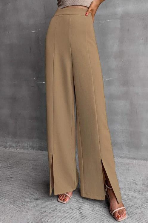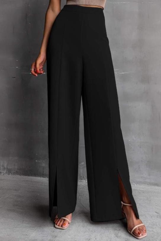 The high waist and elastic waist closure ensure a comfortable and flattering fit for all body types. The split hem adds a unique touch to these pants, making them stand out from the rest. And with the option to machine wash or dry clean, caring for these pants is a breeze.