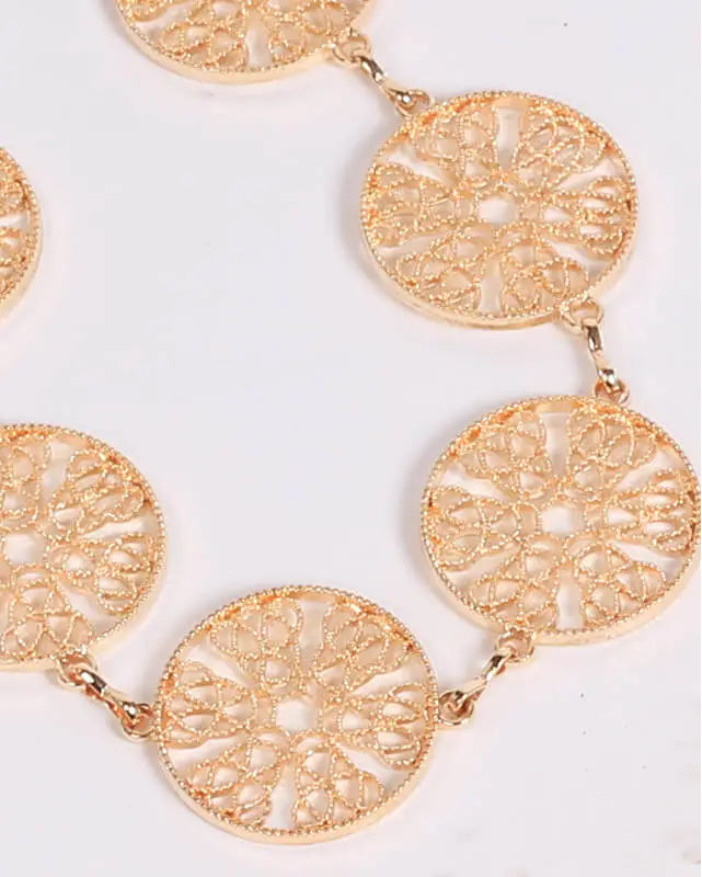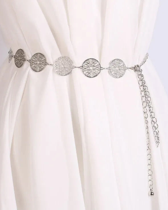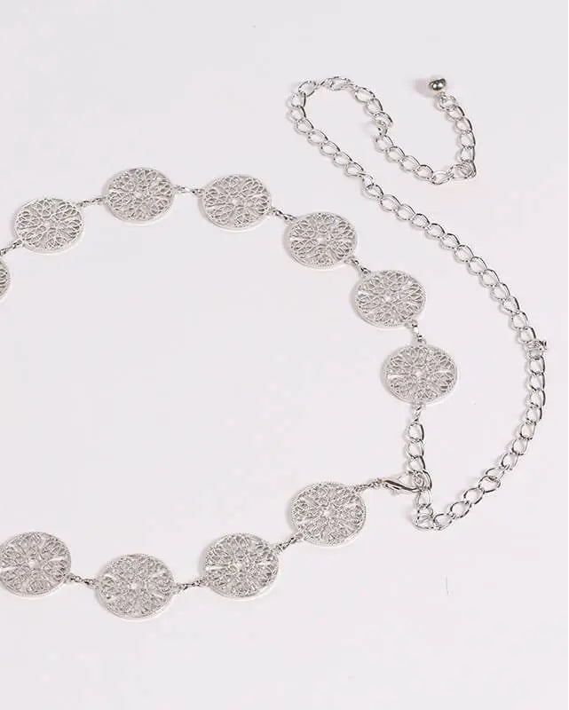 Timeless charm with a touch of edge—this vintage-inspired medallion belt adds instant interest to any outfit. Crafted with detailed filigree discs linked together in a graceful chain, it’s a perfect statement piece to cinch at the waist or drape over the hips. Pair it with dresses, tunics, or high-rise denim for a pulled-together look with just the right amount of shimmer.